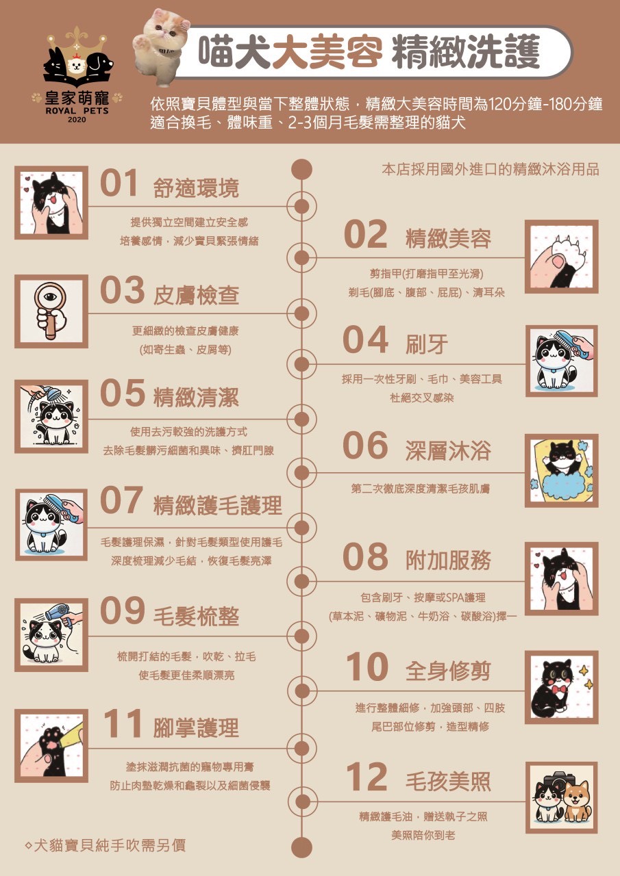 每隻寵物都有自己獨特的需求,我們提供個人化的SPA方案,根據寵物的膚質、毛質以及健康狀況,量身打造最適合的美容保養計畫。